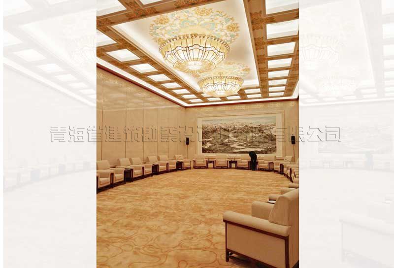 人民大會(huì)堂青海廳根據(jù)全國(guó)人民大會(huì)堂管理局安排重新調(diào)整位置,需要重新裝修改造。新青海廳位于人民大會(huì)堂Ⅱ段三層?xùn)|南角,北側(cè)與人民大會(huì)堂金色大廳和三層小禮堂相對(duì),南側(cè)面向人大辦公樓內(nèi)院。位置與金色大廳和小禮堂位置靠近,原功能為領(lǐng)導(dǎo)人休息廳。青海廳總建筑面積350平方米,會(huì)議廳平面尺寸為29.3米×8.0米狹長(zhǎng)的空間,建筑內(nèi)表面積為222.68平方米,廳內(nèi)原設(shè)計(jì)設(shè)變形縫,中間約2/5處設(shè)框架柱,吊頂高度5.0米左右,周邊設(shè)有服務(wù)間、衛(wèi)生間、配電間等服務(wù)設(shè)施。原裝修為2000年裝修改造工程。廳室尺寸為一狹長(zhǎng)空間,長(zhǎng)寬比達(dá)到1:3.67,空間比例很不協(xié)調(diào),為改造裝修工程帶來(lái)較大的難度,也是改造工程的重點(diǎn)。